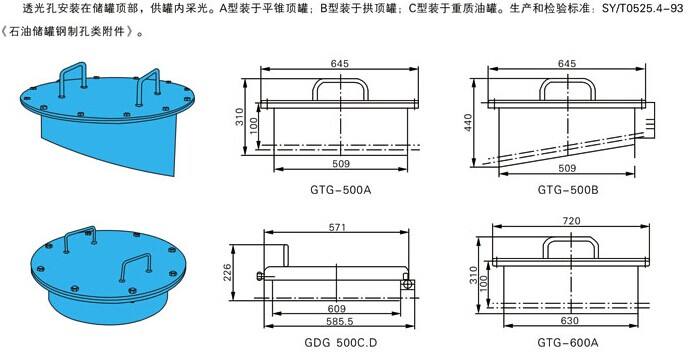 透光分類:A型裝于平錐項罐,B型裝于拱項油罐,C型裝于重質(zhì)油罐,D非標(biāo)定做。
